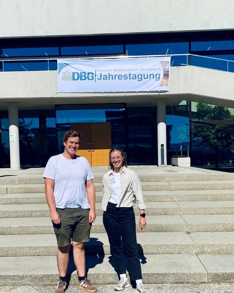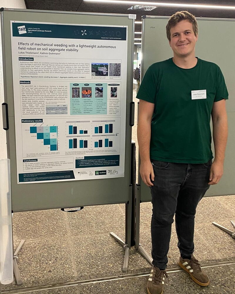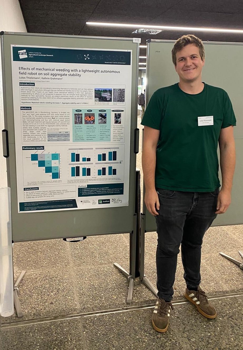 Großen wissenschaftlichen Input für das SoilRob-Team gab es auf der diesjährigen Tagung der Deutschen Bodenkundlichen Gesellschaft (DBG) unter dem Motto #GesundeBödenKlimaschutz, welche vom 13.-18.09.2025 in Tübingen stattfand. In zahlreichen Vortragssessions wie „Humus in landwirtschaftlich genutzten Böden“, „Bodenschutz und Landbewirtschaftung” oder „Struktur, mechanische Eigenschaften und Funktionen von Böden – Struktur und Stabilität“ konnten Lina Rohlmann und Lukas Thielemann ihr Wissen zu Bodengesundheit vertiefen und viele neue Methoden und Ansätze kennenlernen. Ergänzend dazu konnten bei einer Laborführung an der Universität Tübingen verschiedenste Methoden und Gerätschaften hautnah erlebt werden. Fast noch wichtiger war jedoch der persönliche Austausch mit vielen Wissenschaftler*innen vor oder nach den Sessions oder den Veranstaltungen rund um die gelungene Tagung. Neben Input konnten Lina (Postertitel: „Mechanical weed control by lightweight autonomous field robot affects soil water characteristics in sandy loam soils”) und Lukas (Postertitel: “Effects of mechanical weeding with a lightweight autonomous field robot on soil aggregate stability”) auch erste Ergebnisse aus dem SoilRob-Projekt auf Postern vorstellen und diese mit Wissenschaftler*innen diskutieren.