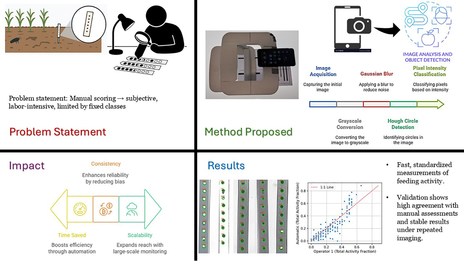 Soil fauna plays a critical role in ecosystem functions such as nutrient cycling, organic matter decomposition, and soil structure maintenance. Accurately assessing their activity is therefore essential for monitoring soil health. Traditional methods like the bait lamina test, while widely used, rely on manual visual scoring, which can be subjective, time-consuming, and difficult to scale. In this study, we present an automated computer vision approach to quantify soil fauna activity by assessing bait consumption on bait lamina sticks, using high-resolution imagery processed with a Python-based pipeline. We implemented this approach on 159 bait sticks gathered from field plots in Brandenburg, Germany, and compared the automated findings with assessments from five independent human operators. The automated method displayed a strong agreement with manual evaluations, yielding Pearson's r between 0.80 and 0.92, depending on the operator, and Cohen's kappa of 0.48 in categorical concordance. The Bland-Altman analysis revealed that over 90 % of the automated scores were within +/− 0.2 of the manual measurements. This automated technique reduced the time required for analysis in comparison to manual scoring, along with removing operator subjectivity and bias. Although there was an underestimation in identifying fully consumed bait holes, the average difference between the automated and manual scores was only 0.02 (p = 0.0049), suggesting a negligible effect size. The automated approach is straight-forward, reproducible, and flexible, which facilitates the efficient and impartial evaluation of soil fauna activity for large-scale soil health monitoring. Possible improvements could involve enhancing the image-analysis workflow, such as improving hole-detection robustness, reducing sensitivity to coating or lighting variation, and exploring more advanced classification models.